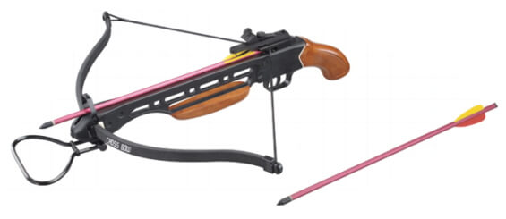 The body is aluminium, with a fibreglass limb and wooden handle. The crossbow has an adjustable sight, alter for wind and elevation. It also has a foot stirrup for easier loading, a safety catch and comes with 2 x aluminium 17″ bolts to get you going (more are recommended)