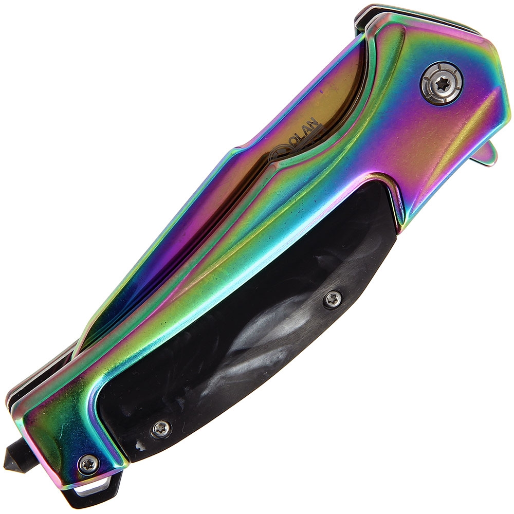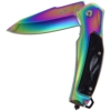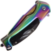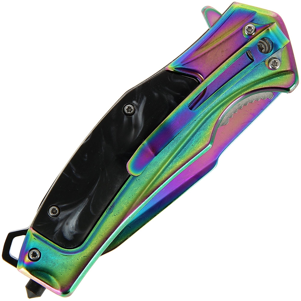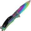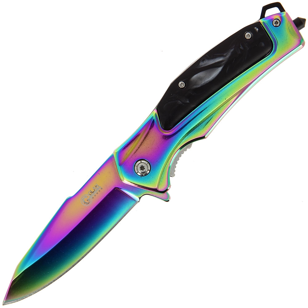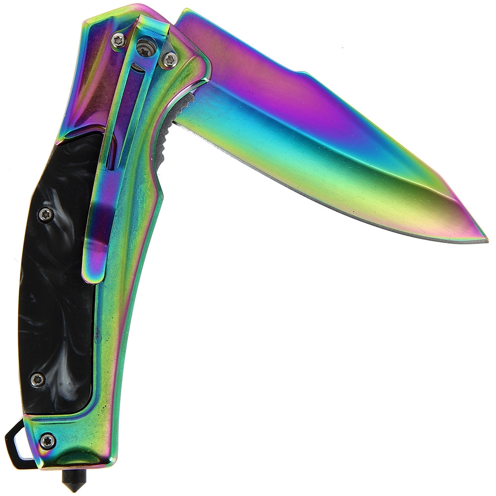 Both striking and functional this linerlock knife stands out with its eye-catching design. The 3.3″ tinite rainbow-anodized, single-edged drop point blade not only adds a vibrant shimmer but also ensures corrosion resistance and enhanced blade durability.