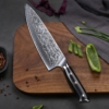 The Japanese Chef’s Knife has a thin 2mm that is extremely tough, tempered to a hardness of HRC 60+2 (a very high rating). Japanese chef knives have a reputation for their lightweight and thin blade that maintains a long edge retention. The handle is made from a beautiful black G10, it is tripled riveted with a mosaic pin in the center. The handle is ergonomic and designed for precision cutting not just its stunning looks.